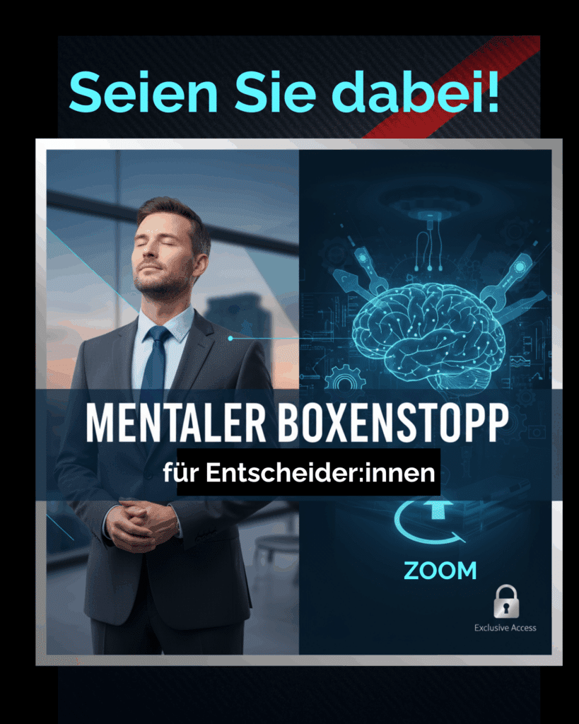 Möchten Sie den Unterschied selbst erleben und lernen, wie Sie Workshops und Boxenstopps optimal für Ihren Erfolg nutzen? Melden Sie sich gerne für einen „Mentalen Boxenstopp für Entscheider“. Ob allein oder im Team – regelmäßiges Stoppen ist Pflicht für verantwortungsbewusste Unternehmer, die ihre Strategien nicht nur planen, sondern auch erfolgreich umsetzen wollen.