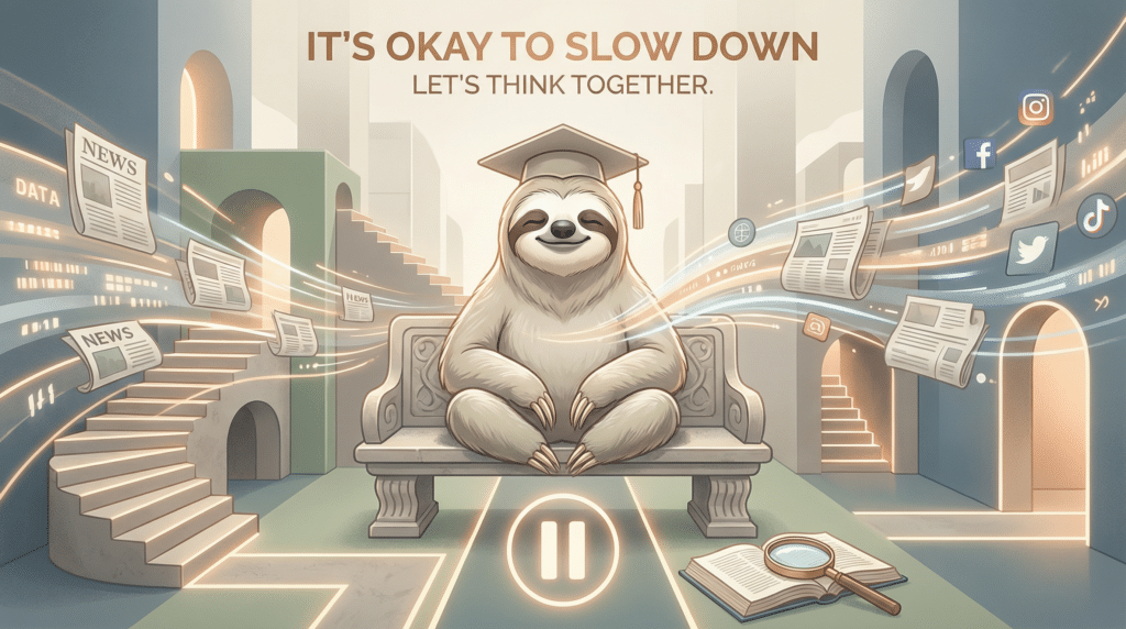 In einer Welt, in der Informationen immer schneller auf uns einprasseln, ist es wert, innezuhalten. Mein kleiner Beobachter – ein Faultier mit akademischem Hut – zeigt uns, dass es möglich ist, klar, freundlich und humorvoll zu reflektieren, ohne auf jede Schnellmeinung zu reagieren. Doch Vorsicht: Ein Faultier ist nicht nur sympathisch, sondern auch gefährlich. Die Dosis macht das Gift.