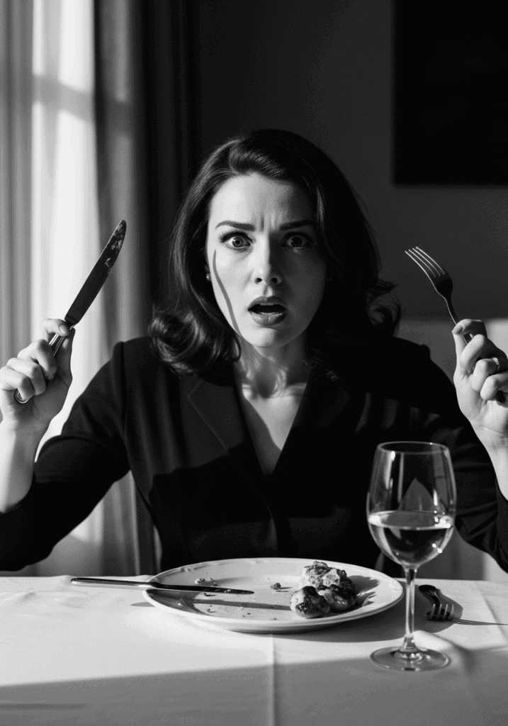 Doch die Wespe kommt wieder – diesmal setzt sie sich direkt auf den Teller meines Gegenübers. Und in diesem Moment passiert etwas, das mich starr werden lässt.