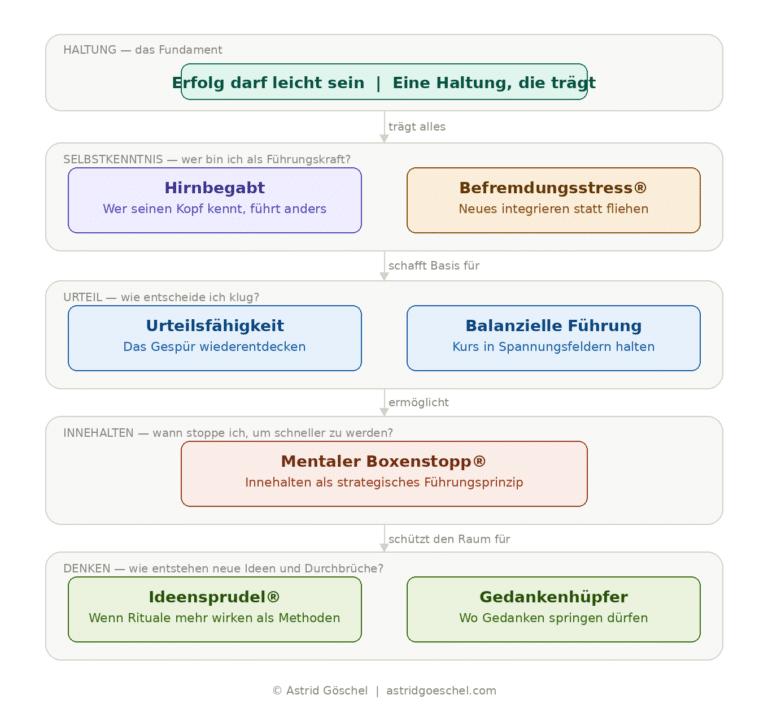 Das ist der Ausgangspunkt. Nicht als Versprechen, sondern als Überzeugung: Wer mit sich selbst im Reinen ist, führt anders. Wer weiß, warum er tut, was er tut, braucht weniger Energie für das, was er nicht tut. Diese Haltung ist kein Lebensratgeber. Sie ist ein Führungsprinzip.